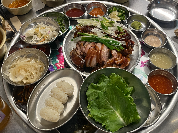 큰 쟁반에 족발이랑 소스랑 반찬이 한 번에 나왔다.