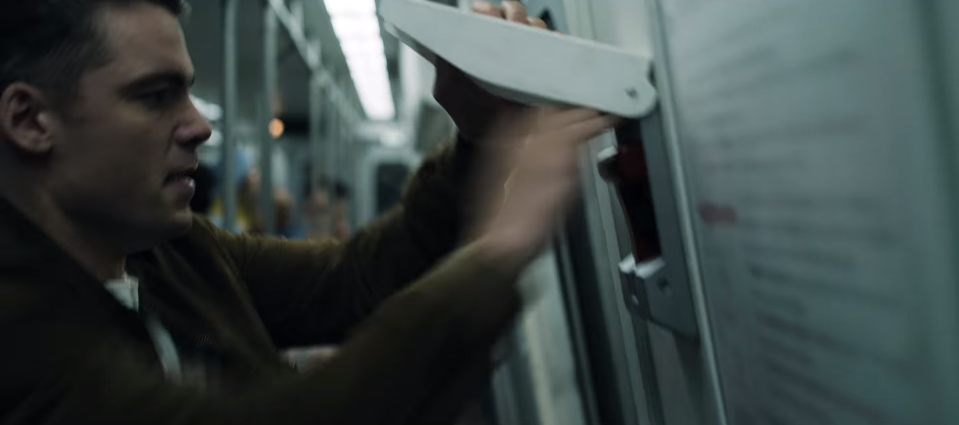 폭탄을 발견한 피터는 지하철의 비상 개폐 장치를 서둘러 내리고 사람들에게 외칩니다.