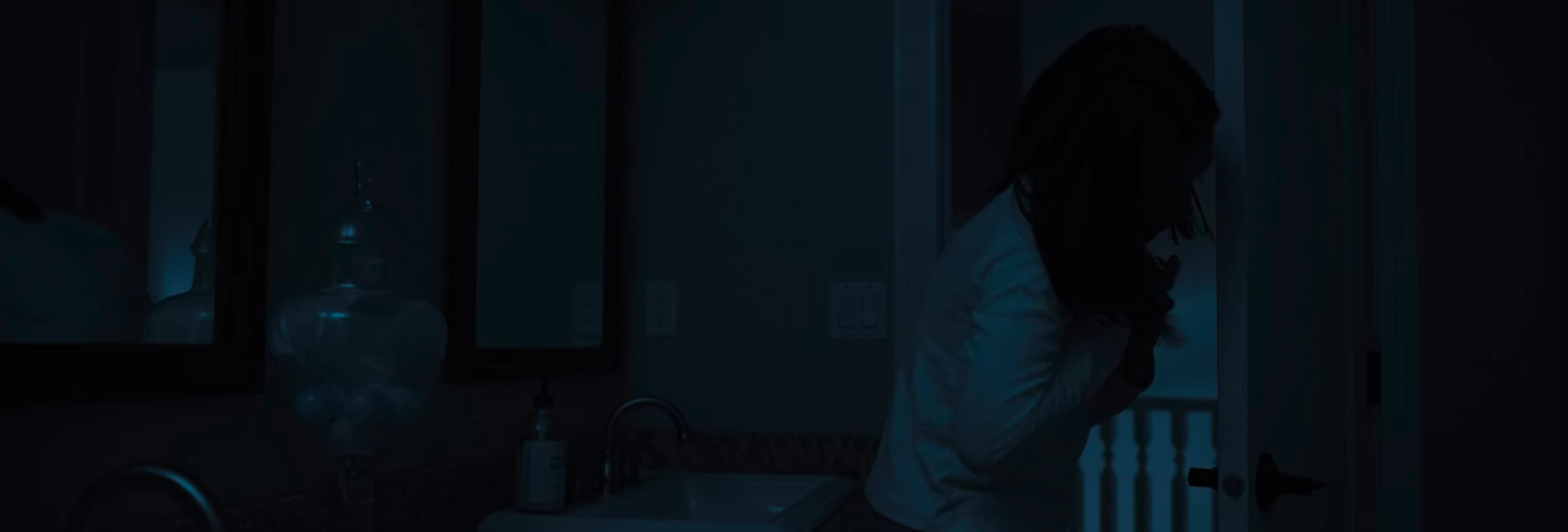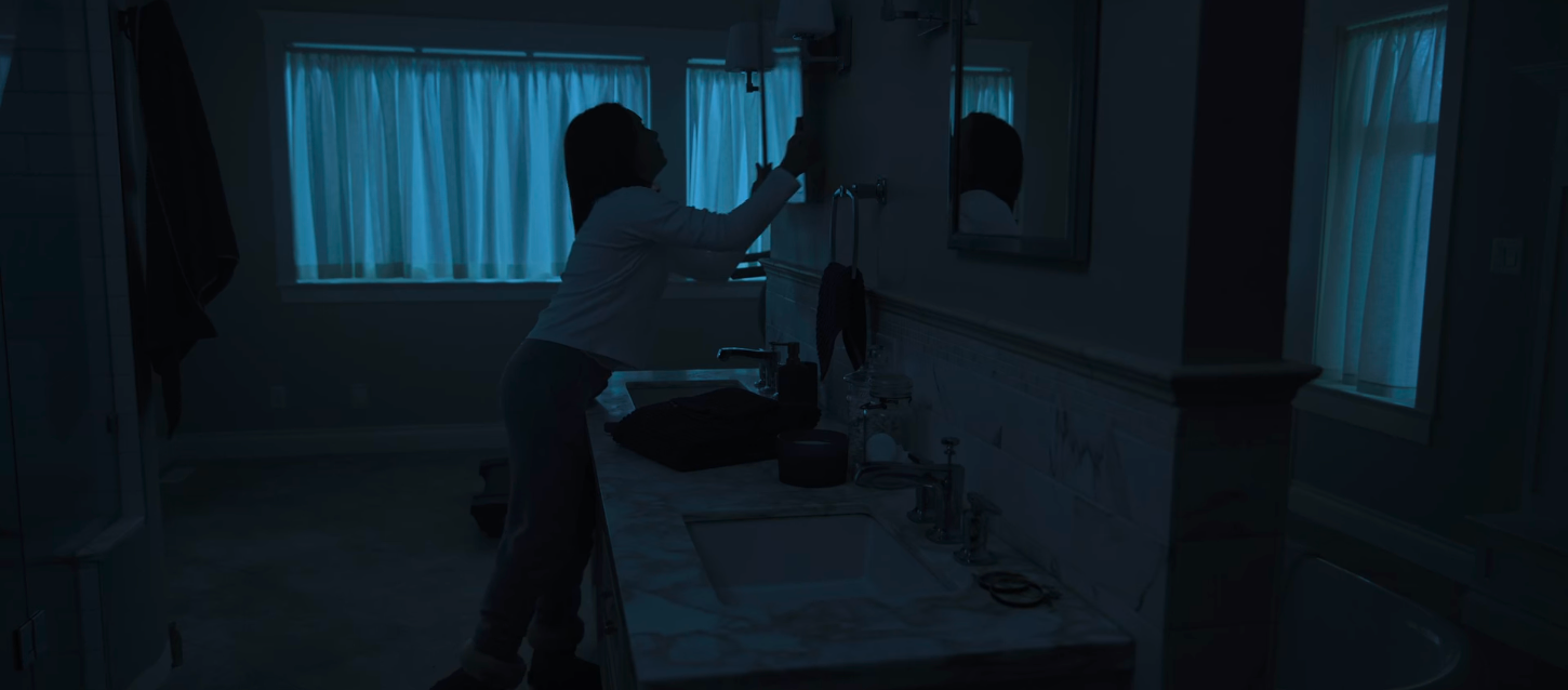 침실로 도망가는 도중 침입자의 움직임을 확인하기 위해 거울을 복도에 두는 기지를 발휘하는 똑똑이 로즈.