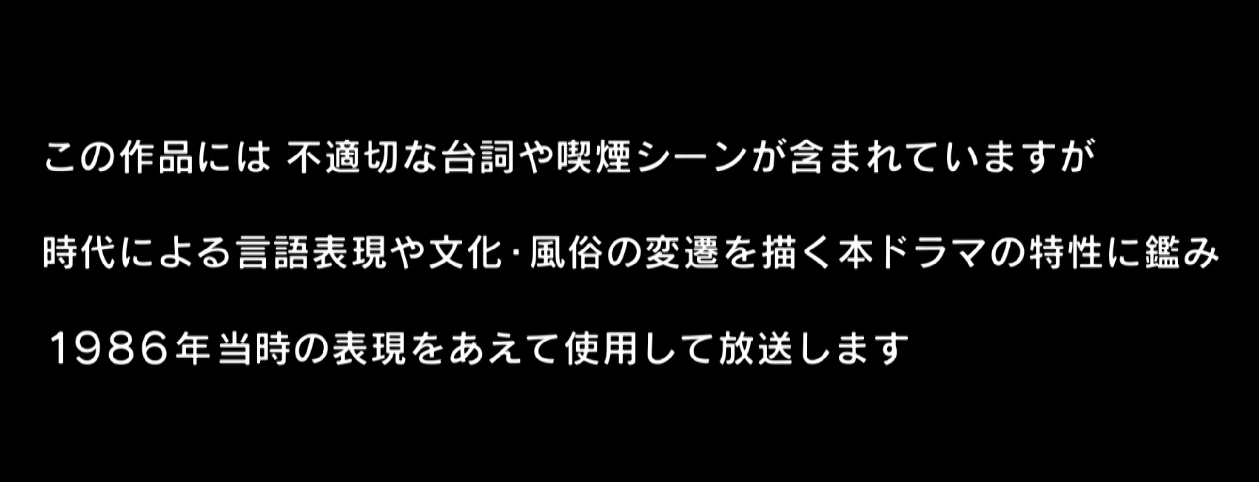+참고) 드라마가 1980년대와 현재를 왔다 갔다 하는 드라마다 보니 80년대의 일본문화가 가감 없이 그려지는데, 이 때문에 드라마 시작 전에 아래와 같은 멘트가 나온다.