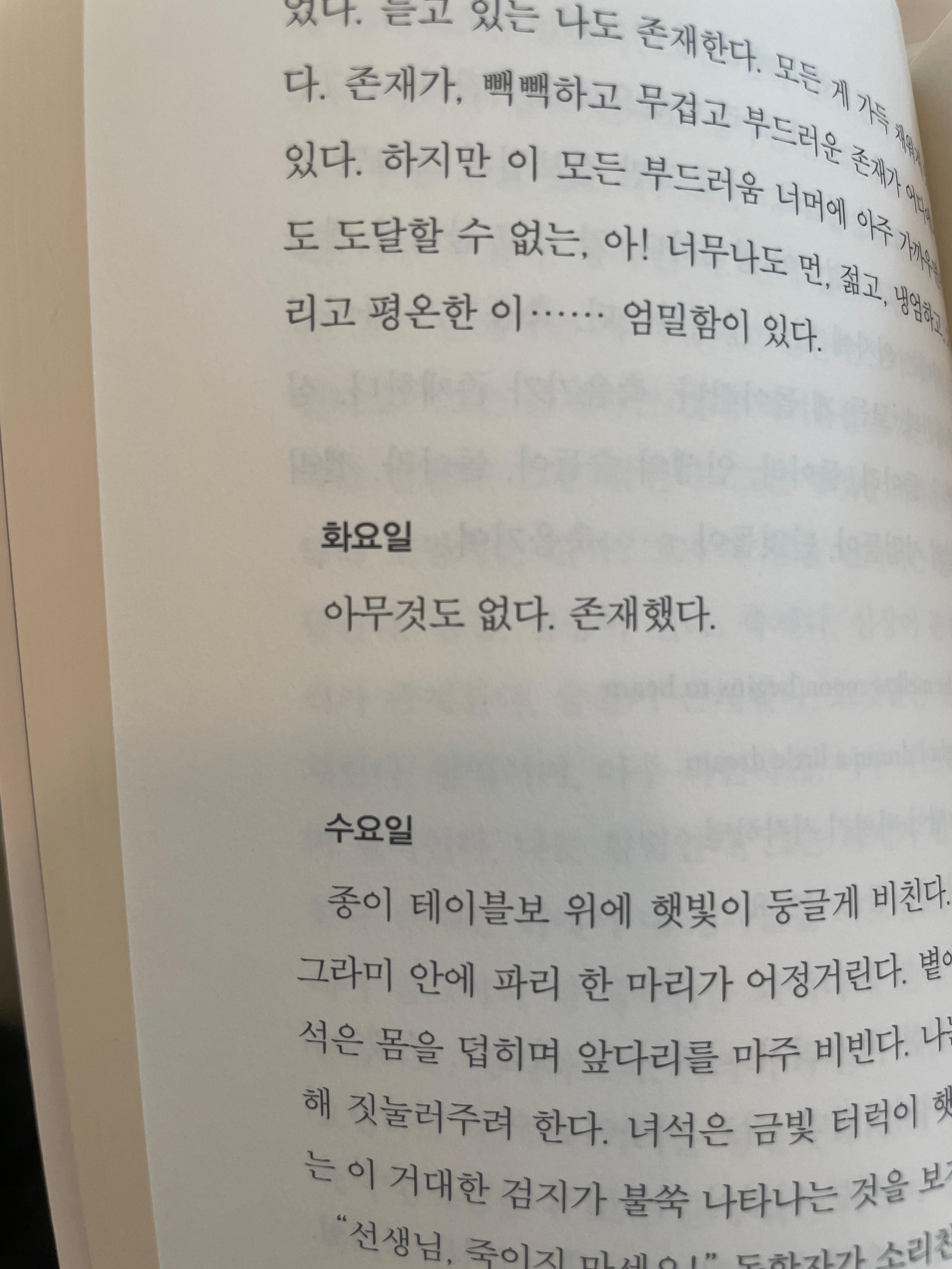 줄거리에서 얘기했던 물수제비를 하면서 구토를 느끼는 것도 앞 내용에서 어떤 이야기의 빌드업 같은 거 없이 정말 생뚱맞게 물수제비 휘릭 -> 구토감 느낌으로 바로 이어져서 읽는 내내 뇌가 고통스러웠다. 내가 너무 체계적인 이야기 짜임에 익숙해져있나 보다.