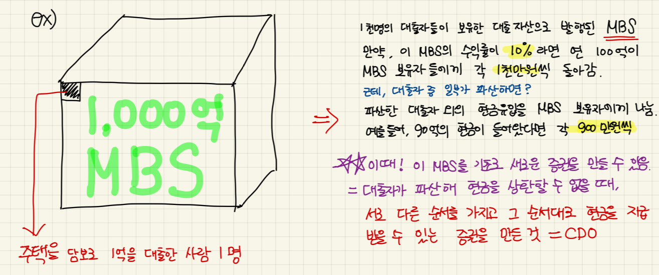 저번 포스트에서 투자은행들이 SPE, 특수목적법인을 설립하여 MBS, 주택담보부 증권을 일반투자자들에게 판매를 했다는 내용까지 정리했다. 이번 포스트에서는 MBS에서 더 나아가 부채 담보부 증권, CDO(collateralized debt obiligation)에 대해서 정리를 해보도록 하겠다.